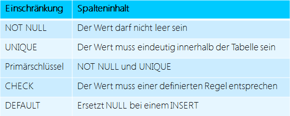 Einschränkungen sind Regeln für die Daten in einer Datenbank und zielen darauf ab, die Datenqualität sicherzustellen. Damit sind Einschränkungen unser erster Kandidat zur Implementation von Geschäftsregeln. Wir unterscheiden zwischen Fremdschlüsseln (Foreign Keys) und Attribut-Einschränkungen.